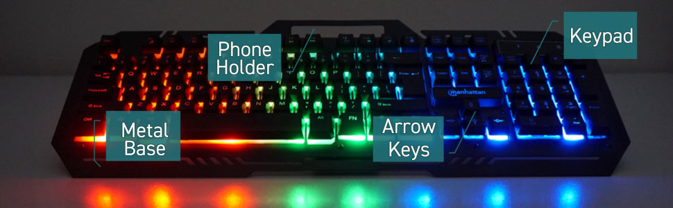 This Gaming Keyboard features an intelligent, robust design to guarantee sturdiness and comfort, while each key offers quiet, responsive keystrokes. Whether you're playing in an intense gaming session, navigating expansive spreadsheets or entering numeric data, the keyboard equips you with hushed efficiency in nearly any setting. Colorful LED backlighting that pulsates or holds steady is visually pleasing, and it's helpful in low-light settings. A perfect replacement or complement to any Windows® computer, the Manhattan Gaming Keyboard - Metal Base Edition is an essential component of any gamer's field of play.