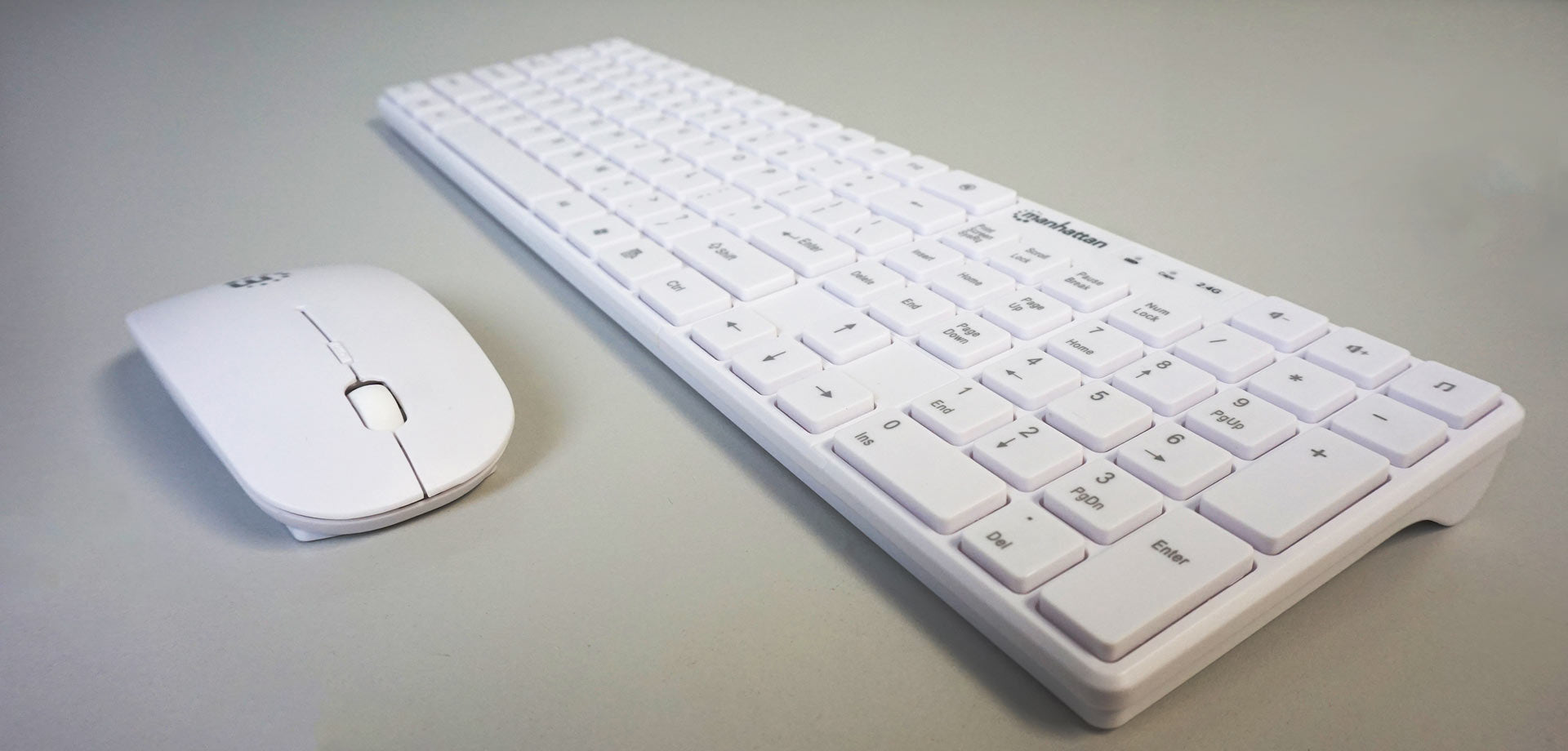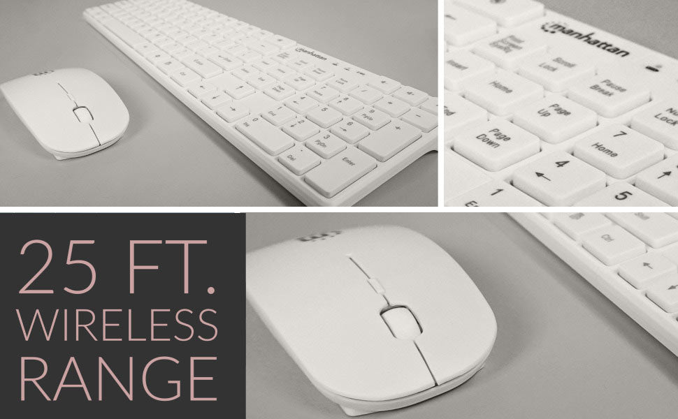 The Manhattan Wireless Keyboard and Optical Mouse Set combine excellent value with comfort and durability. The Wireless Keyboard offers a robust key structure, highly responsive keys, an easy-access command panel, various multimedia functions and a full-sized numeric keypad that provide the immediate familiarity of the modern keyboard. When used in tandem with the included Wireless Optical Mouse, with its adjustable 800/1200/1600 dpi, standard buttons for left and right clicks, and an easy-access a scroll wheel, you are sure to notice an increase in how much you can get done.